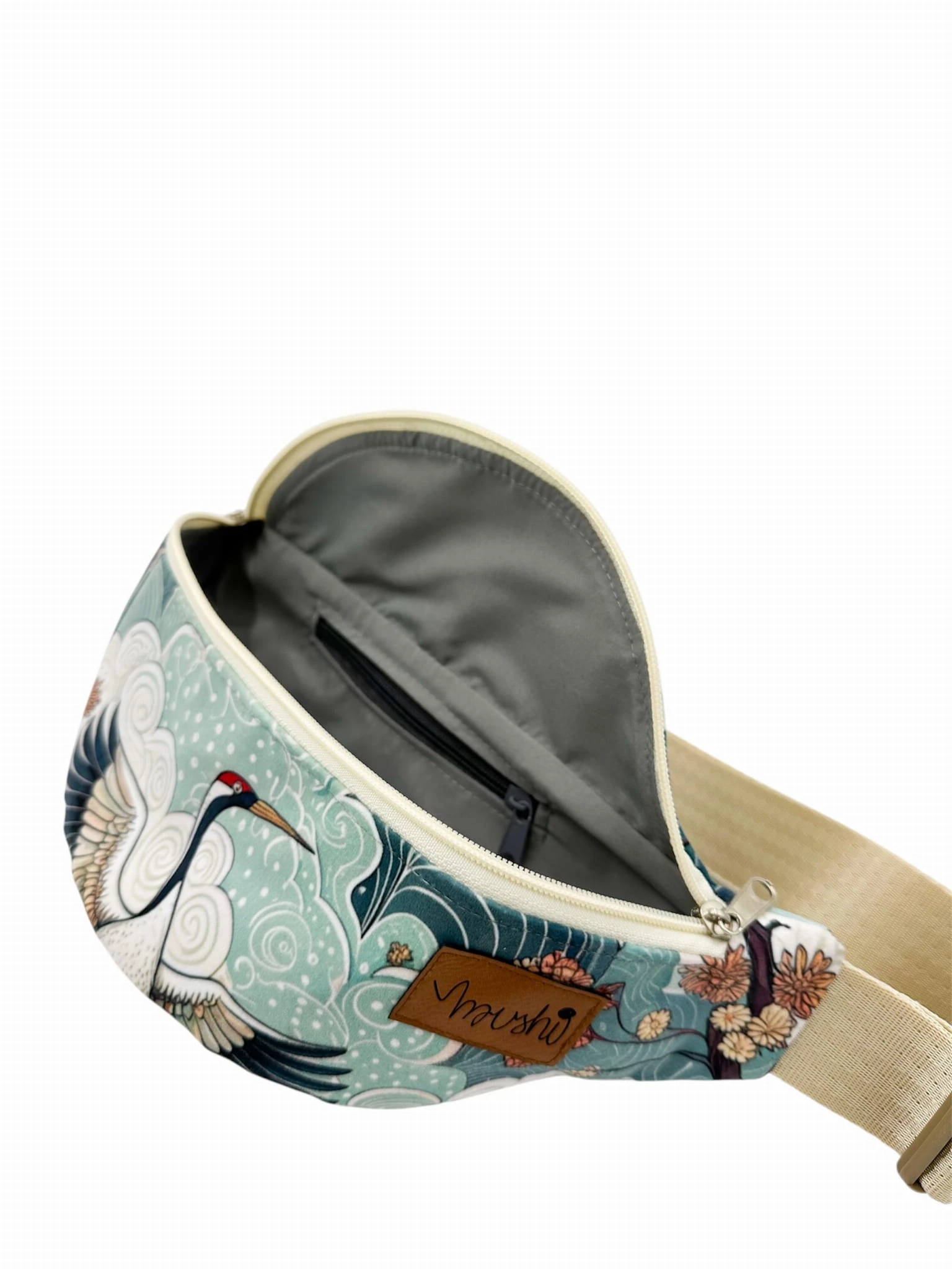Nerka wykonany jest z mocnego, tapicerskiego weluru. W środku znajduje się wodoodporna podszewka. Saszetka wiele pomieści. W nerce znajduje się mała kieszonka wielkości kart płatniczych.