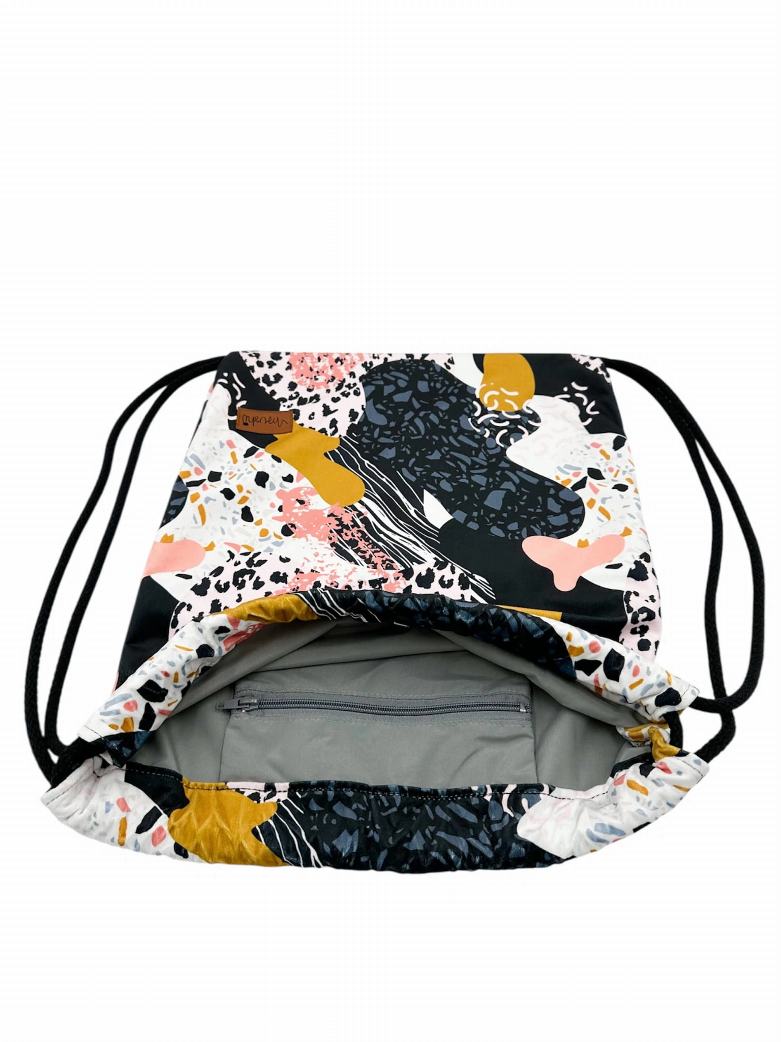 Plecak wykonany jest z miękkiego i przyjemnego w dotyku weluru tapicerskiego (materiał przypomina aksamit). W środku znajduje się wodoodporna podszewka, a na niej naszyta jest kieszonka na zamek- mieszcząca telefon czy inne używane bibeloty. Plecak mieści format A3, oraz bez problemu laptopa 15".